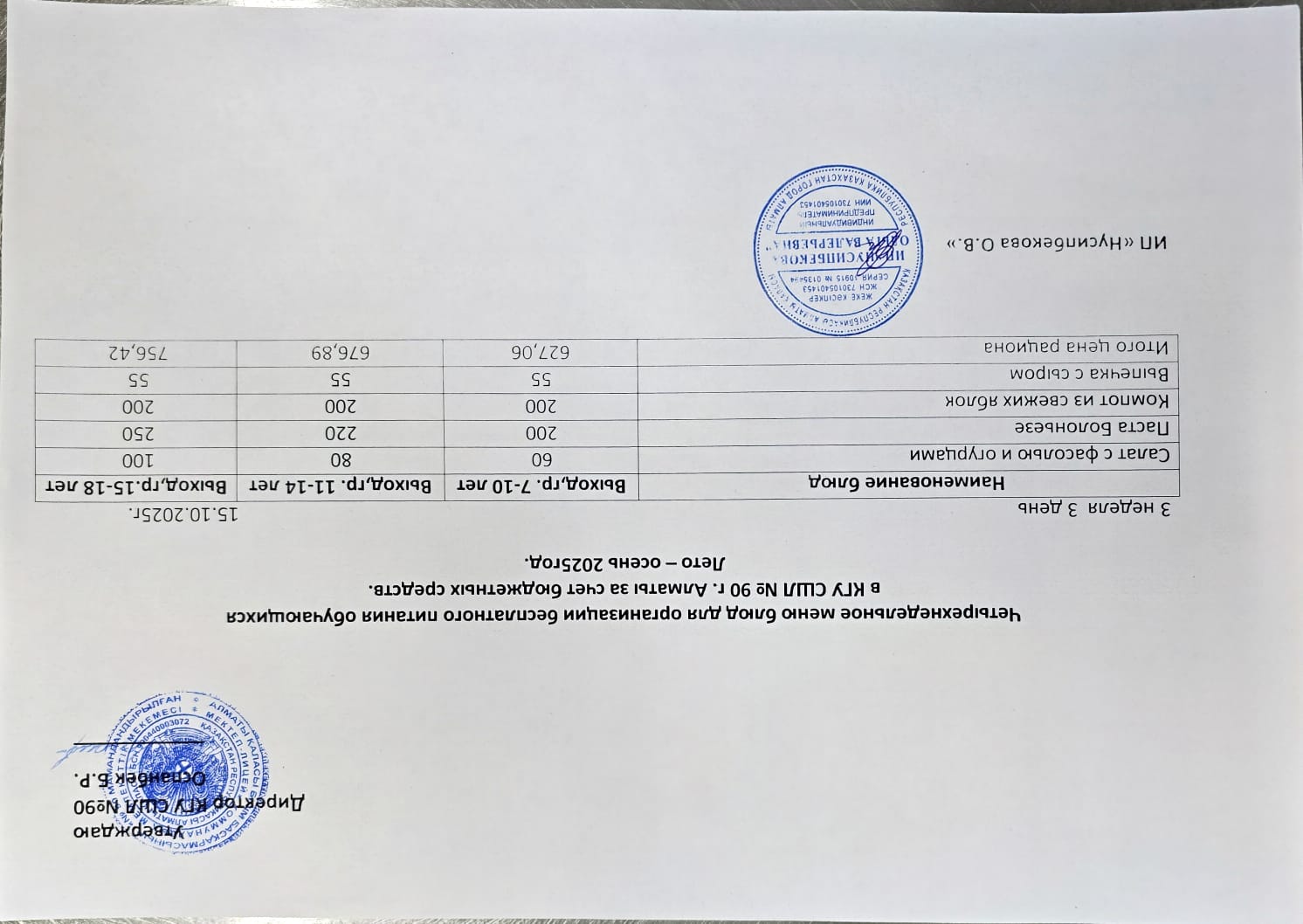 Ас мәзірі 15.10.2025 / Меню 15.10.2025