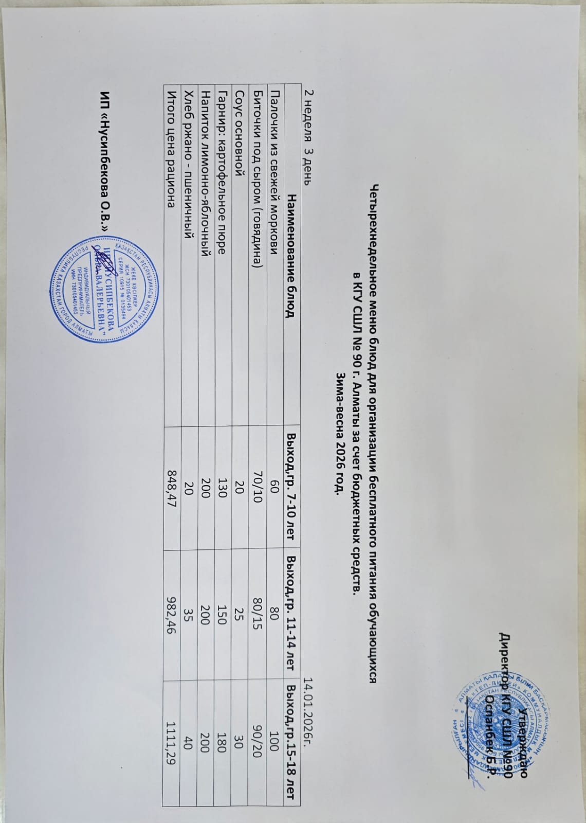 Ас мәзірі 14.01.2026 \ Меню 14.01.2026