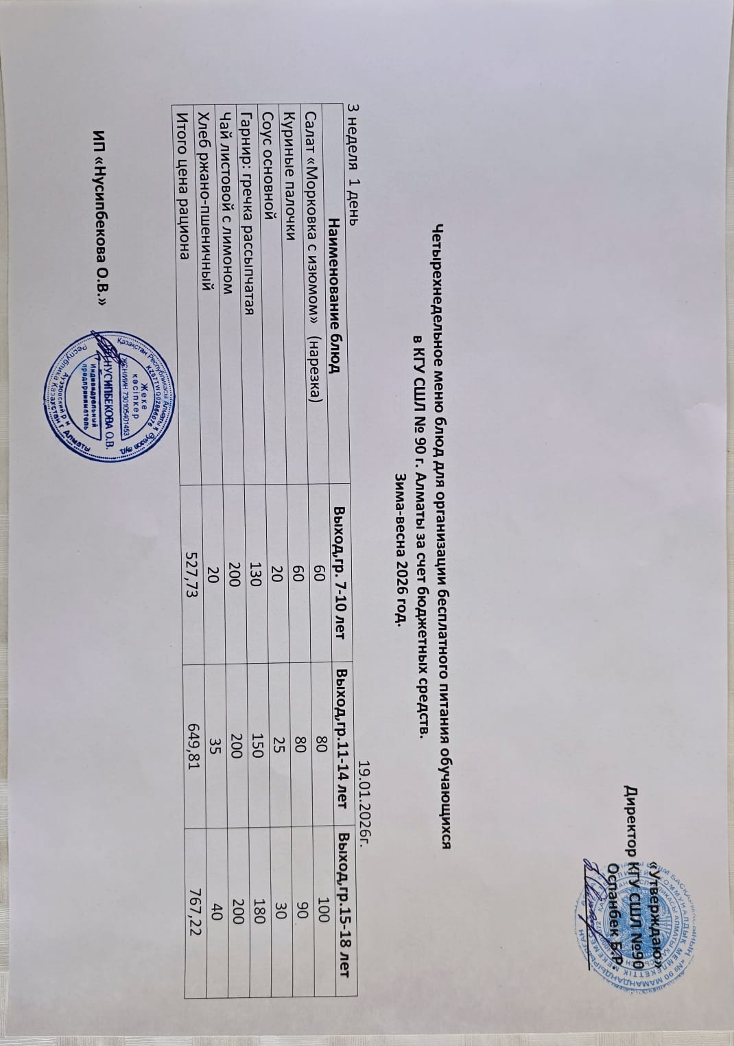 Ас мәзірі 19.01.2026\ Меню 19.01.2026