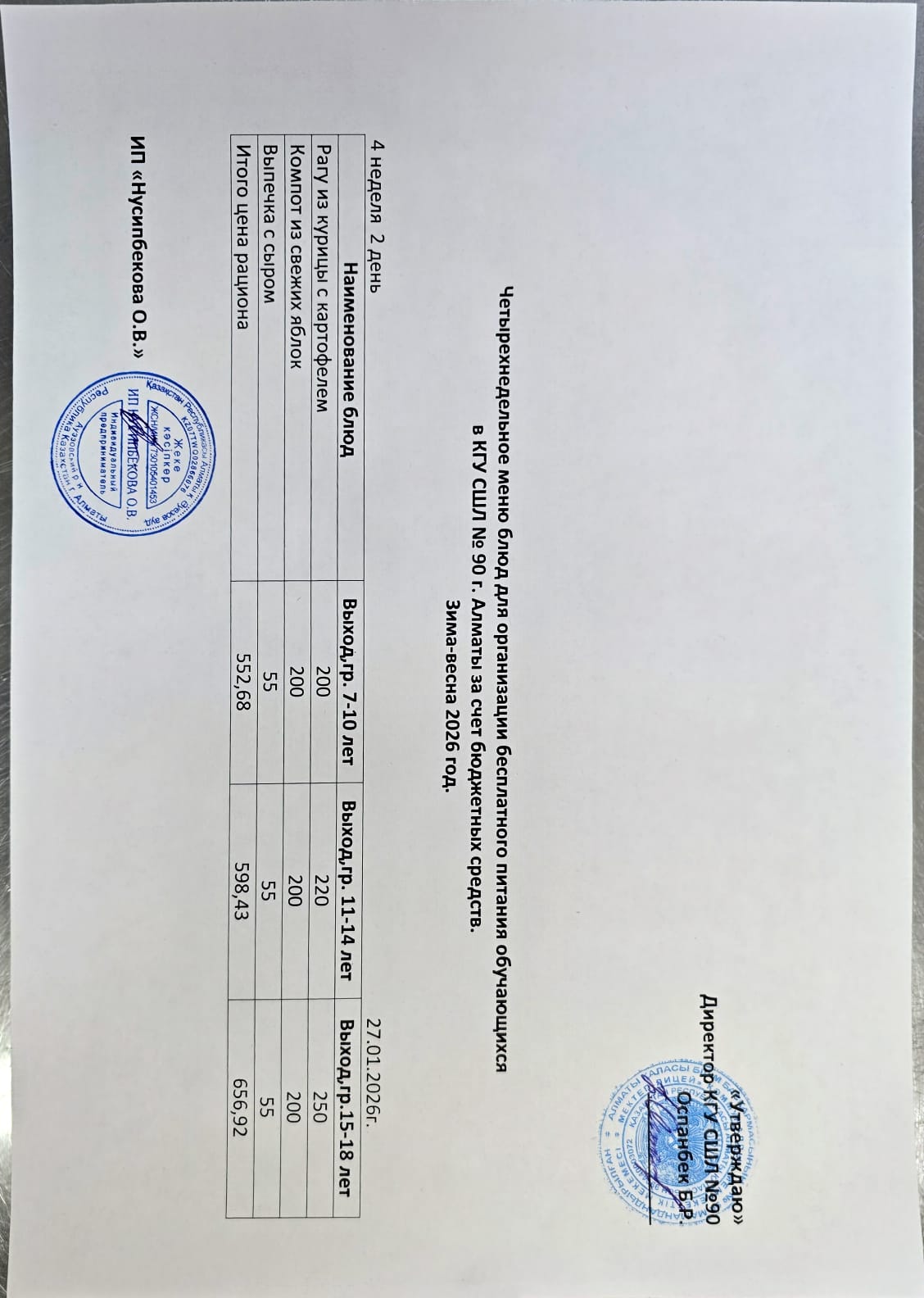 Ас мәзірі 27.01.2026 \ Меню 27.01.2026