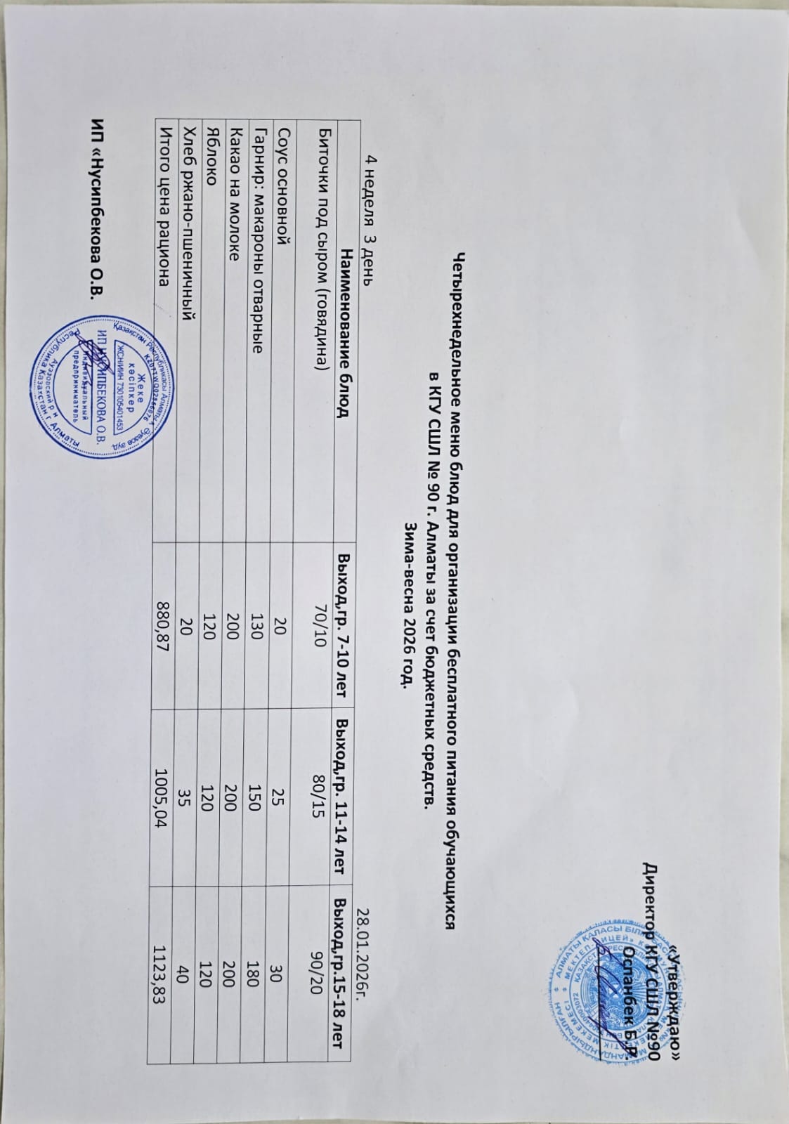 Ас мәзірі 28.01.2026 \ Меню 28.01.2026
