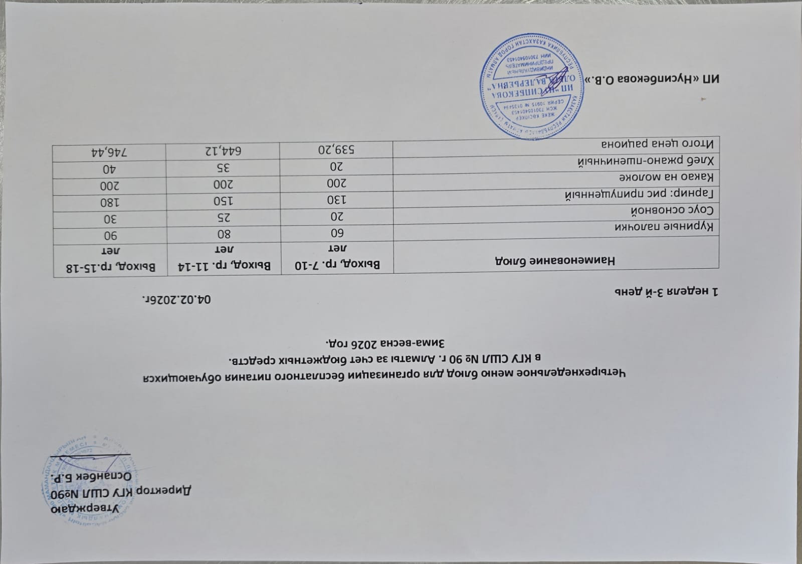 Ас мәзірі 04.02.2026 \ Меню 26.02.2026